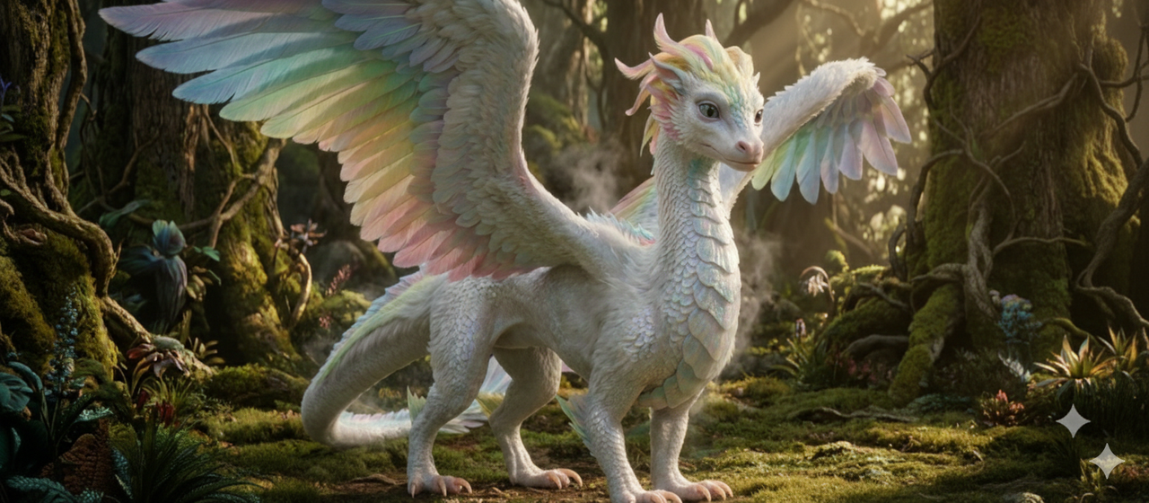 Her scales are pearlescent white, catching every color the sun can give—soft greens, blush pinks, pale gold. Vast wings unfurl slowly, feathers shimmering with living magic. The earth beneath her feet blooms instantly—tiny flowers pushing through moss and stone alike.